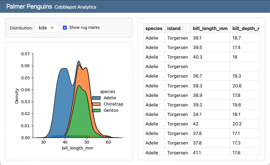 A screenshot of a Penguin Bills card. The card toolbar contains two dropdown menus, one for Variable and one for Distribution and a checkbox to show rugmarks. Below, a plot shows a histogram of bill_length_mm colored by species.
